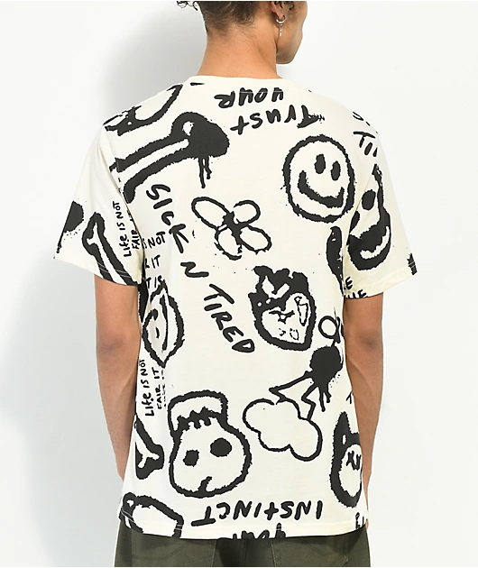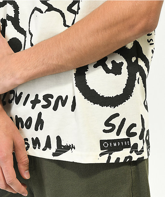 The Dogs Dinner Empyre t-shirt comes in a natural colorway with sublimated graphics in black throughout; featuring script reading, \”Sick n tired,\” butterflies, and a smiling face. This shirt is made of a soft cotton-poly blend and comes in a relaxed fit w