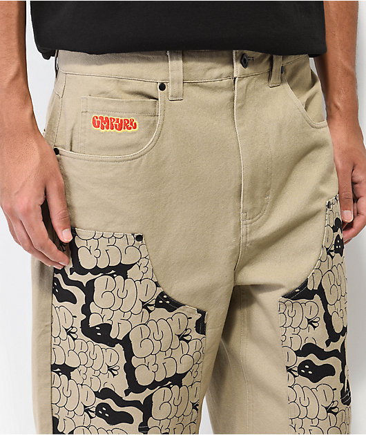 These canvas skate pants from Empyre are made of 100% cotton and come in a khaki colorway with double knee patches adorned with black bubble letters repping the brand name. These comfortable pants boast embroidered brand patches on the right front hip and