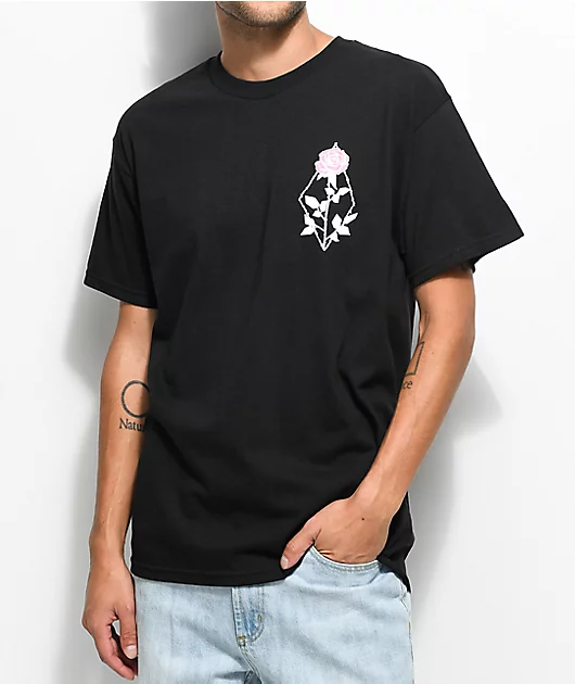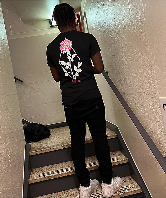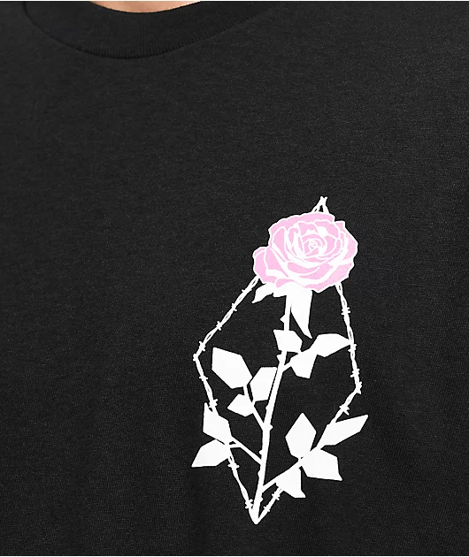 The Flora Empyre t-shirt is made from soft, breathable cotton, and comes in a black colorway with a white and pink screen-printed rose graphic on the front, while the back bears a barbed wire diamond graphic.