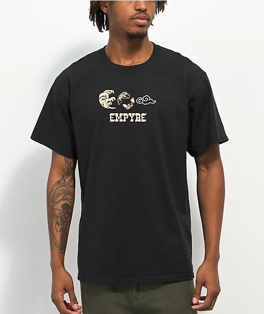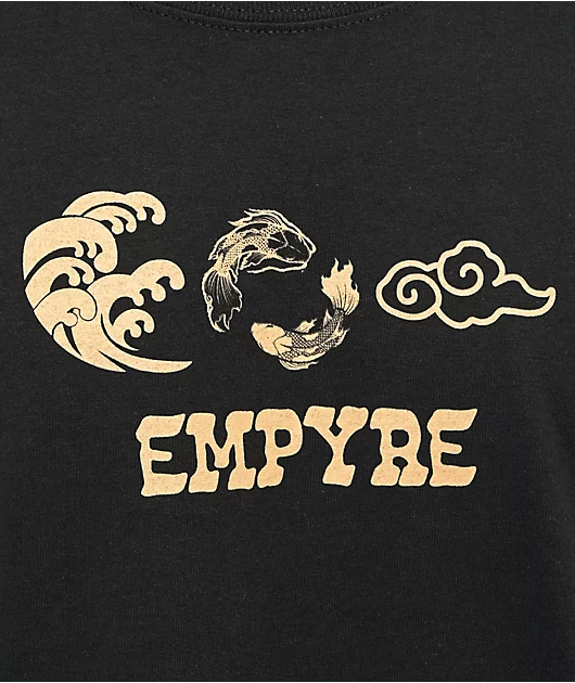 The Embrace Duality t-shirt from Empyre comes in black, and features a screen-printed graphic at the left of two Koi fish swimming in unison with a wave on one side, and a cloud on the other, as well as Empyre logo script just below. Decorating the back o