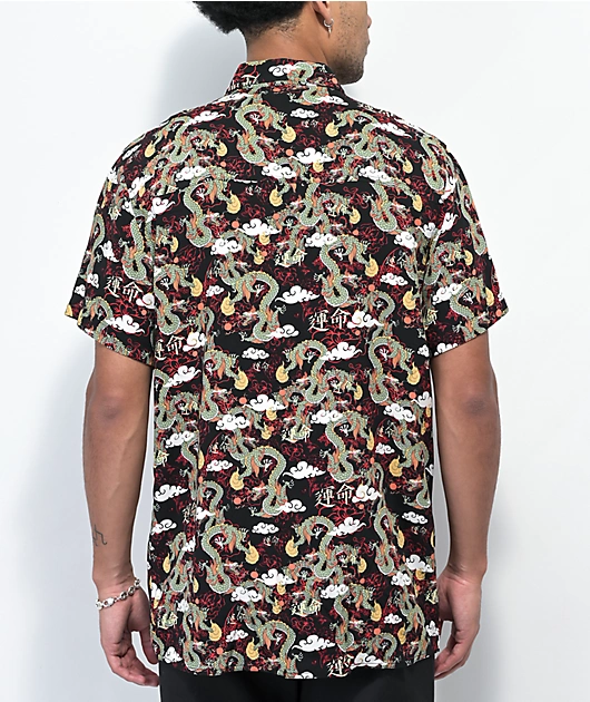 The Feudal Flames short sleeve button up shirt by Empyre comes in a black color scheme. The all over print pattern features green dragons accented with red floral graphics and yellow text reading \”destiny\” in Chinese characters. The smooth, silky, rayon c