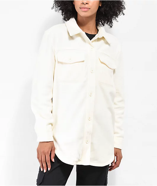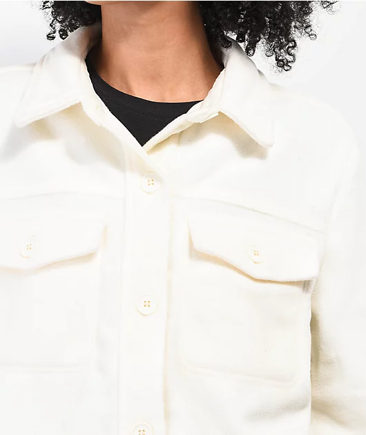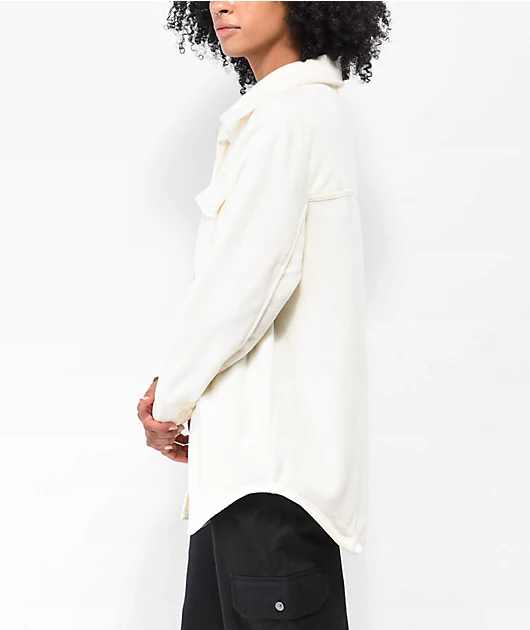 The Finley tech fleece from Empyre comes in a creamy white fleece construction, with a classic button up design. Coming in a slightly oversize silhouette, the ultra soft jacket has a fold over collar, a lined interior, dual chest pockets, and a rounded bo
