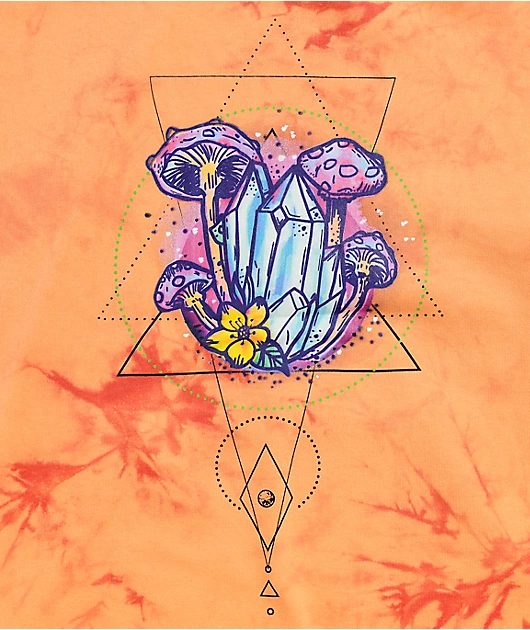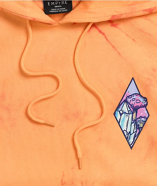 Spice up your life with the Fredia orange tie dye hoodie from Empyre! This soft, relaxed-fit hoodie comes in a brilliant orange colorway, with a graphic of mushrooms and crystals on the back for a nature-inspired look fit for any fall wardrobe.