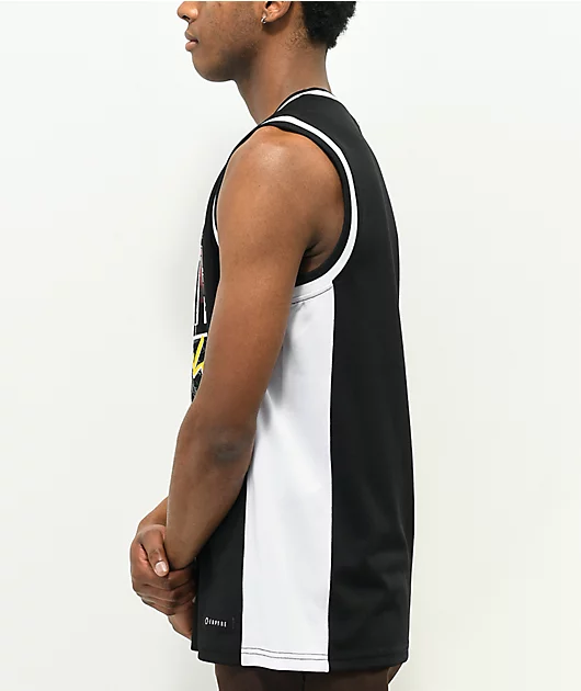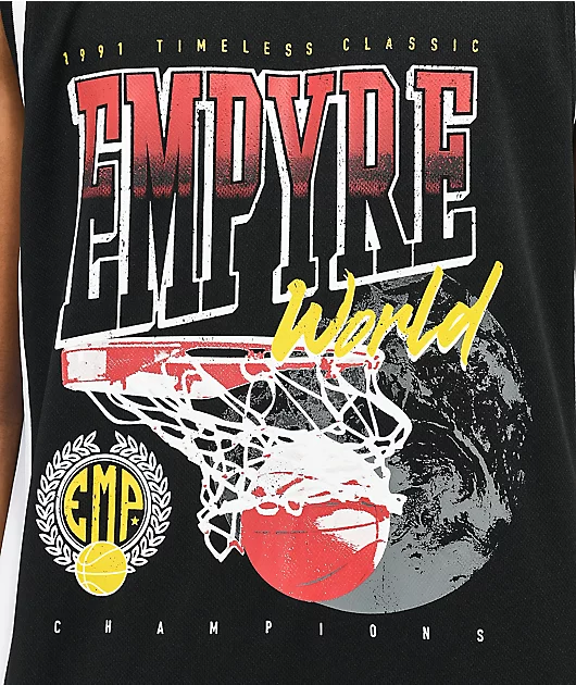 The Free Throw jersey from Empyre has a classic basketball silhouette, a black chest and back, and white stripes down the abdomen, and is constructed of lightweight, breathable mesh. On the chest is a screen-printed graphic of a basketball hoop and globe,