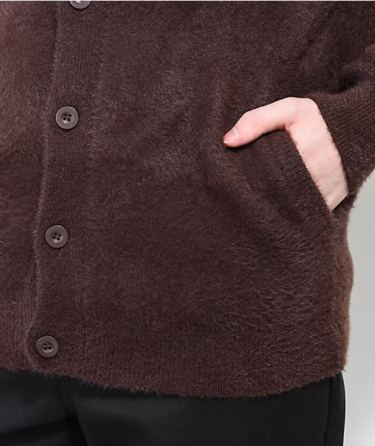 In a dark brown colorway comes the Frizzle cardigan from Empyre, displaying the embroidered image of a frowning face left of chest in a yellow accent that draws the eye. This unique cardigan, with a fur-like texture, features a full button closure; coming