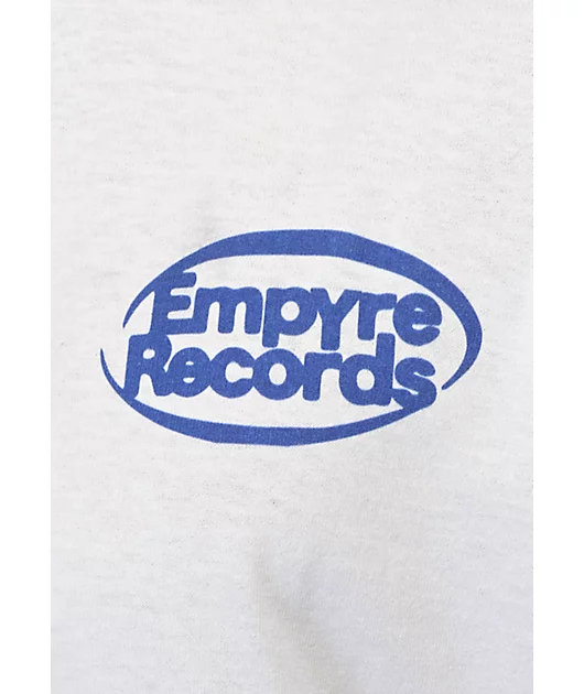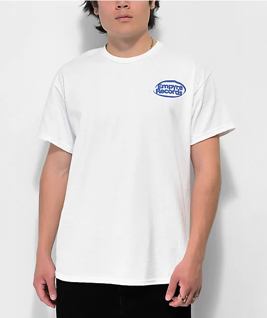 The Get Spinnin t-shirt from Empyre comes in a white colorway, with screen-printed \”Empyre Records\” script on the left of chest and a back graphic of a personified record surrounding by script that says, \”Get to spinnin’.\”