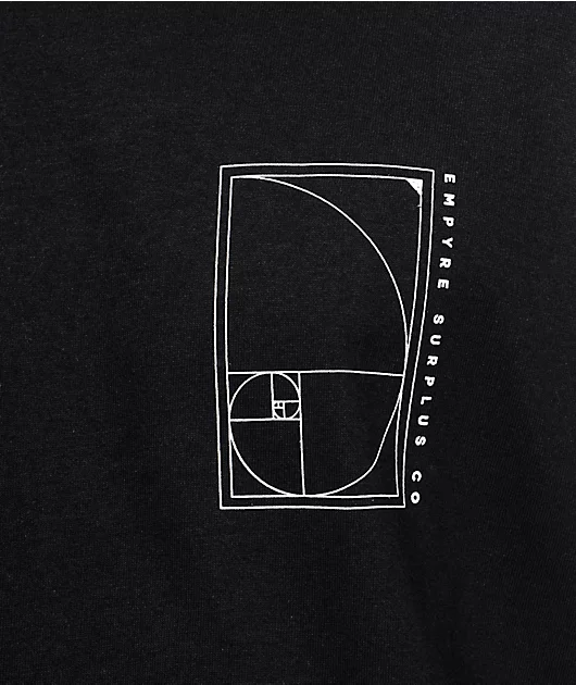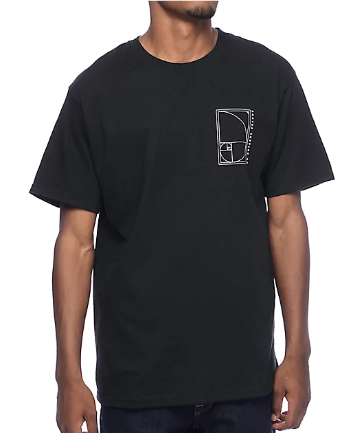 The Golden Ratio is found in nature and is a creative’s Golden Rule. The eye pleasing ratio of this mathematical equation is shown on the left chest by itself and shows the power of the universe and the Golden Ratio in action of the back.