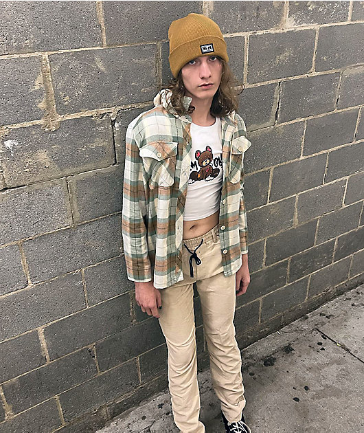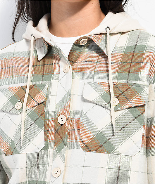 The Holly flannel shirt jacket from Empyre offers a layered look with a green and grey plaid body and an attached hood. The flannel shirt construction throughout provides a layer of warmth to any outfit, whether you this shacket alone or layered over your