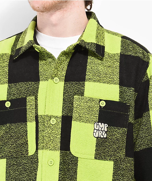 The House woven flannel shirt from Empyre comes in a bright green colorway with black plaid patterning throughout, offering a classic style with a turndown collar and button closure sleeve cuffs. This heavy winter shirt is made from a durable polyester, c