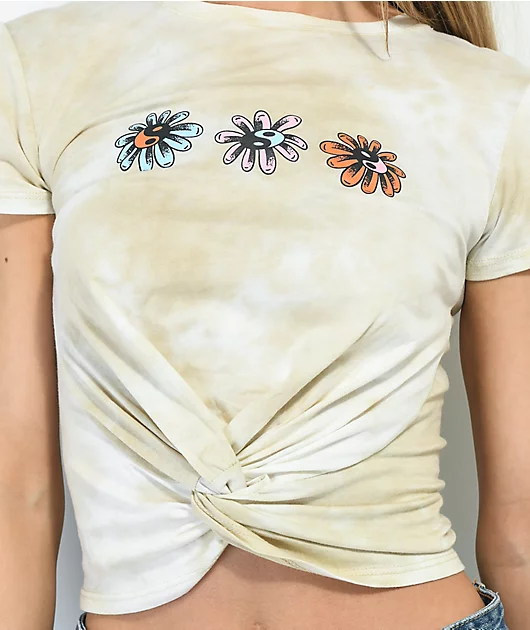 The Ilaria Empyre t-shirt comes in a cropped construction with a twist tie detail on the front and a neutral tie dye colorway. This shirt features a screen-printed graphic across the chest of three flowers with yin-yang centers for a psychedelic look.
