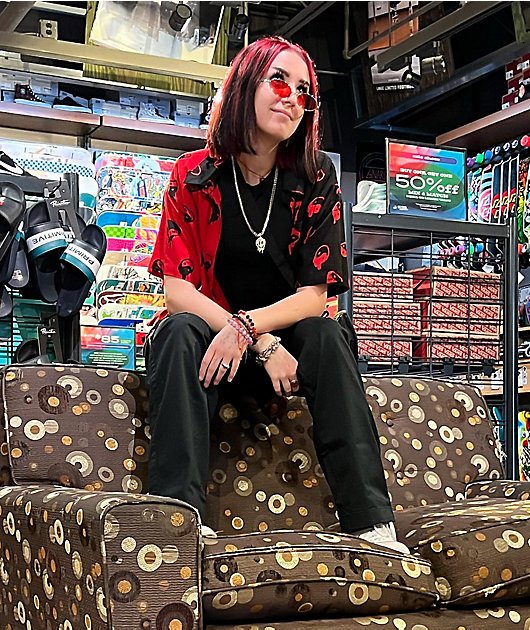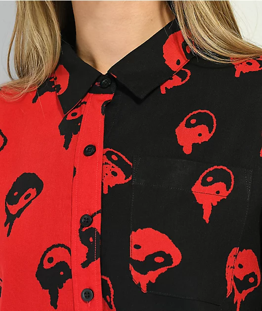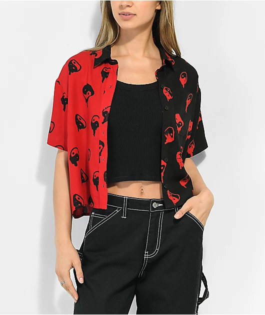 The Joana Yin Yang Empyre button up shirt comes in a cropped, short sleeve construction made out of 100% rayon for a lightweight, breathable fit with a straight bottom hem and front left pocket. With a split black and red colorway, each side boasting melt