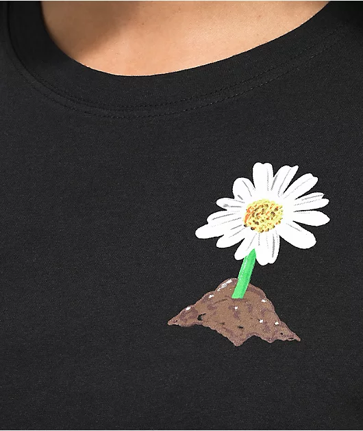 The Kipsy In Our Hands short-sleeve crop t-shirt from Empyre has an unfinished hemline and boxy fit. It comes in a black colorway with a screen-printed flower on the left of the chest while, on the back, a skeleton’s hands burn as it holds up the Earth wi