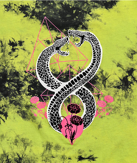 Add some grunge-inspired color to your look with the Kipsy snake green tie-dye crop t-shirt from Empyre. The green and black tie-dye colorway adds some interest to the look, while a grahic of two snakes duke it out on the back. Finished off with black tap