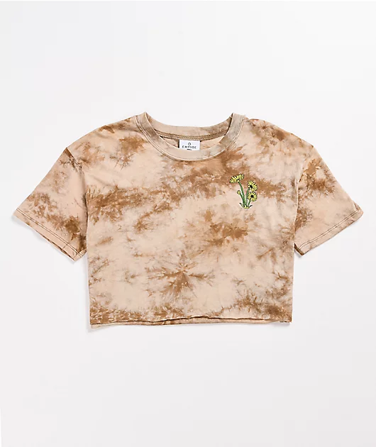 Fresh, fun, and a little trippy, the Empyre Kipsy tan tie-dye crop t-shirt from Empyre is here to take your look to a higher level. Coming in a tan tie-dye colorway, this cropped tee features screen-printed flowers at the left chest and graphics of a skel