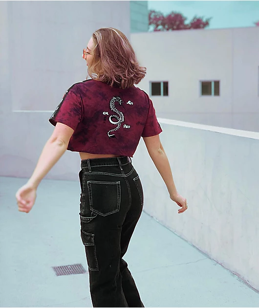 Complete your unique style with the Kipsy Tape red tie dye crop t-shirt from Empyre. This crop tee comes with a red and black tie dye wash throughout, while the left chest features white vertical lettering. The sleeves are adorned with black satin tape wi