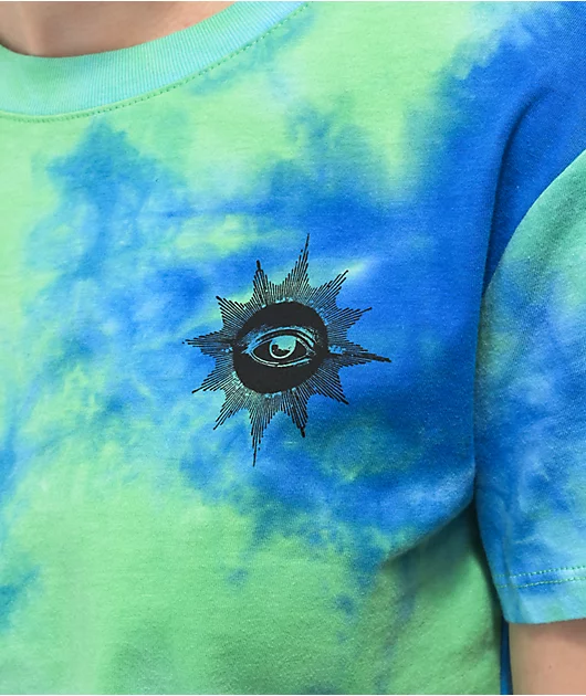 The lightweight, breathable Laynie t-shirt from Empyre comes in a blue and green tie dye colorway and displays a screen-printed sun graphic on the left side of the chest while the back bears a collage of graphics including a skeleton, column, and text rea