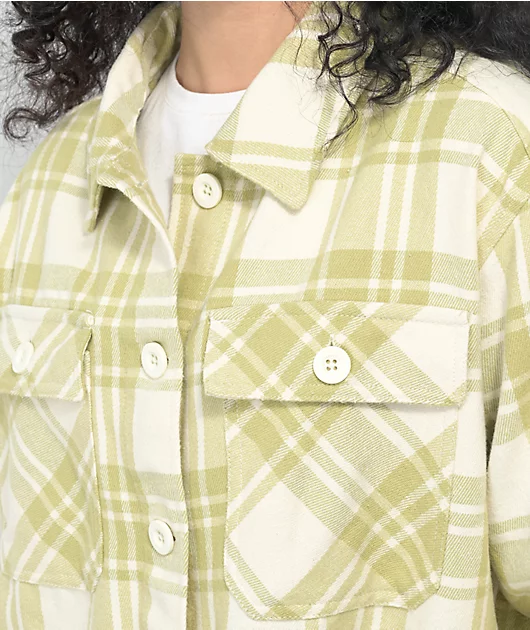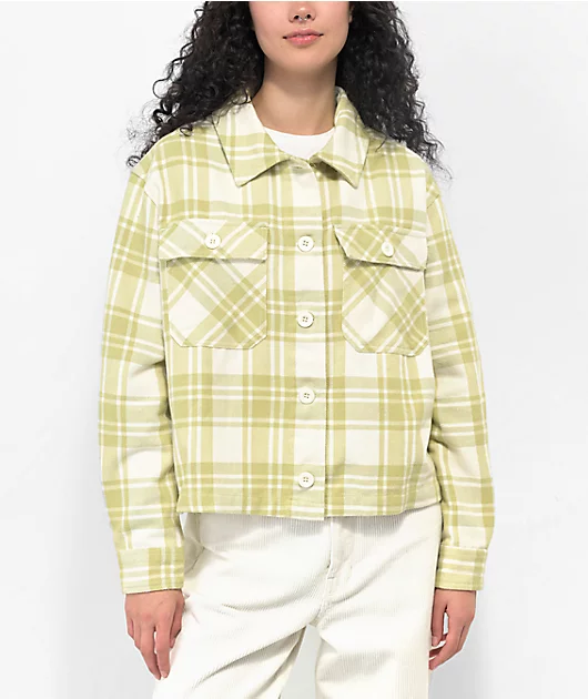 The Lita flannel shirt from Empyre comes in a green and white plaid construction with full button up closure, a classic turndown collar, and dual button down chest pockets. This shirt has a crop fit with a finished bottom hem and a long sleeve constructio