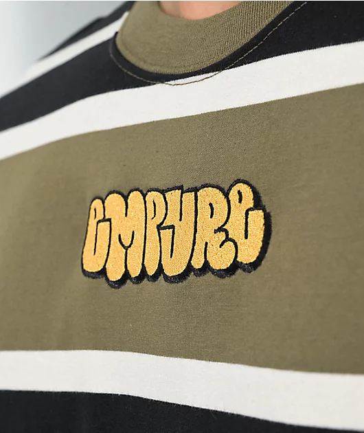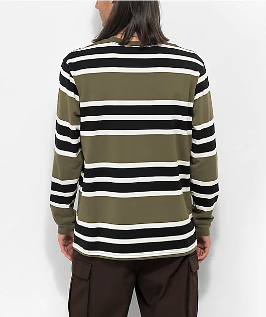 The Logan t-shirt from Empyre is made of a cotton-poly blend and comes in a long sleeve construction with olive, black, and white horizontal stripes throughout. Adorning this shirt is gold embroidered Empyre script across the chest for bold branding.