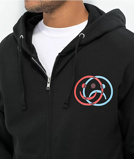 The Love Hate zip hoodie from Empyre comes in a black colorway with a screen-printed smiling and frowning face on the left of chest as well as 3D script on the back reading, \”Love me\” in red and blue. For a stylish and comfortable look, this hoodie has fu