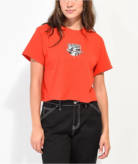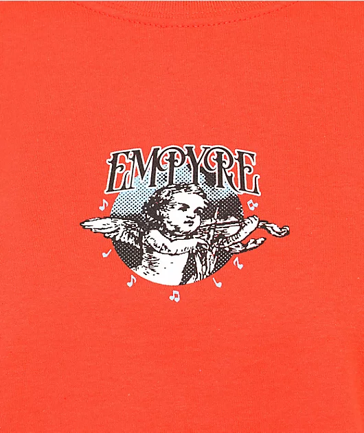 The Love Song crop t-shirt from Empyre comes in a red colorway, with a screen-printed graphic of an angel on the chest, and brand script above. A larger graphic of two skeletons kissing, and text reading \”Just like a love song.\” appears on the back, as th