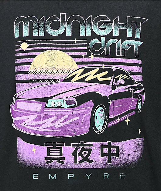 Slip some speedster-friendly style into your attire with Empyre’s Midnight Drift black long sleeve t-shirt. The tee’s long-sleeved silhouette and cotton construction keep it cozy and soft, while screen-printed graphics of a purple sedan silhouetted agains
