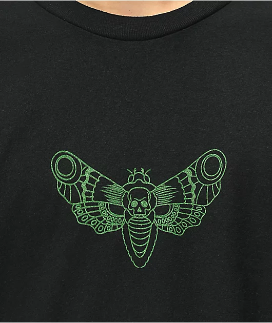 Get yourself a menacing new look with Empyre’s Mystique Black T-Shirt. Featured with an overall black colorway that’s highlighted with matching dark green graphics located on both the chest and back that include the silhouette of a moth marked with a sini