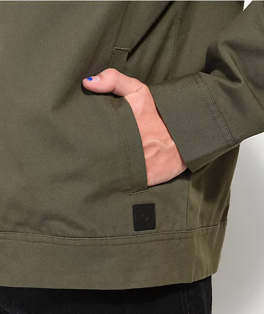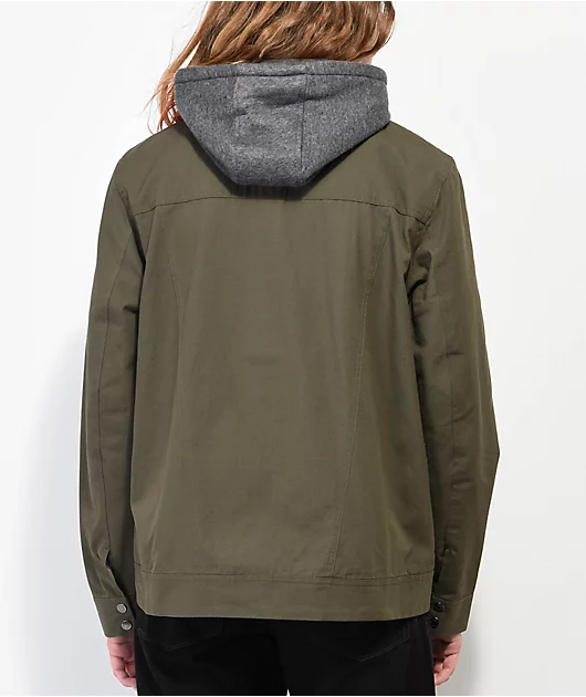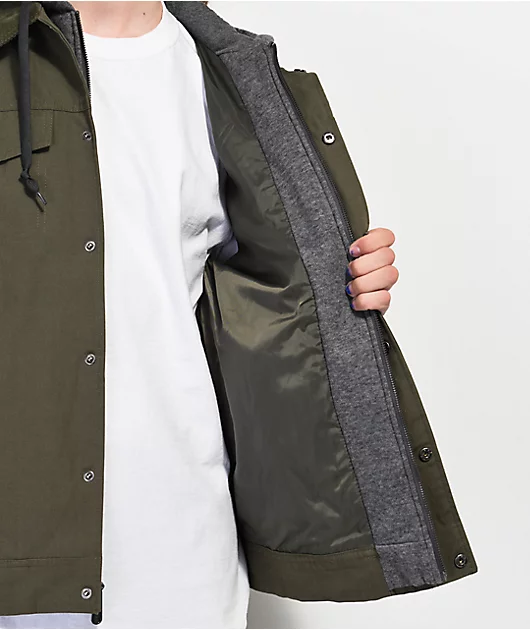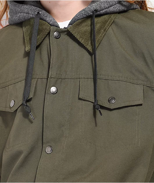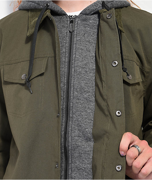 With a layered design, the olive green Pledge jacket from Empyre offers a stylish look without the bulk. Constructed with a combination zip and snap closure, along with a corduroy collar, the jacket provides casual feel to any outfit. With dual chest pock