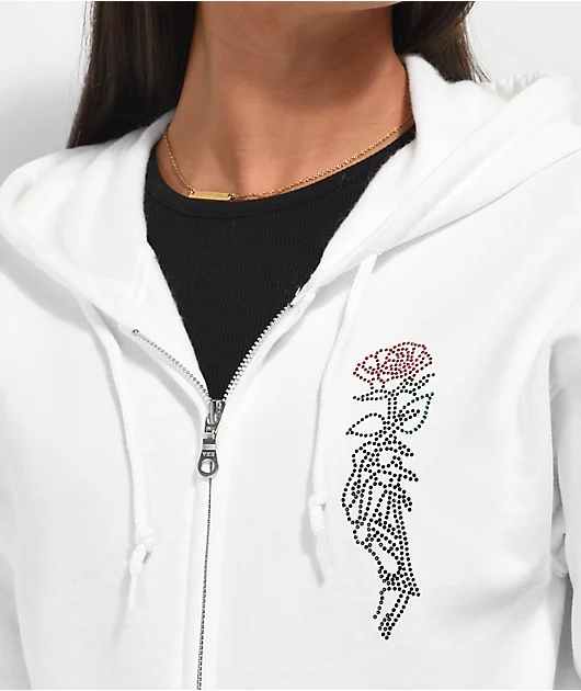 In a white colorway comes the Rose Rhinestone hoodie from Empyre, showing of a rhinestone rose being held by a skeleton’s hand left of chest. This hooded sweatshirt offers easy layering with other pieces thanks to a full zip closure, coming complete with