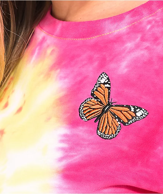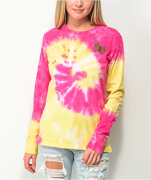 Get a little psychedelic with your outfit thanks to Empyre’s Rubino Old Soul pink tie dye long sleeve t-shirt! This soft, lightweight cotton long-sleeve tee has a pink-and-yellow tie-dye treatment throughout, lending it a swarm of color, while the front b