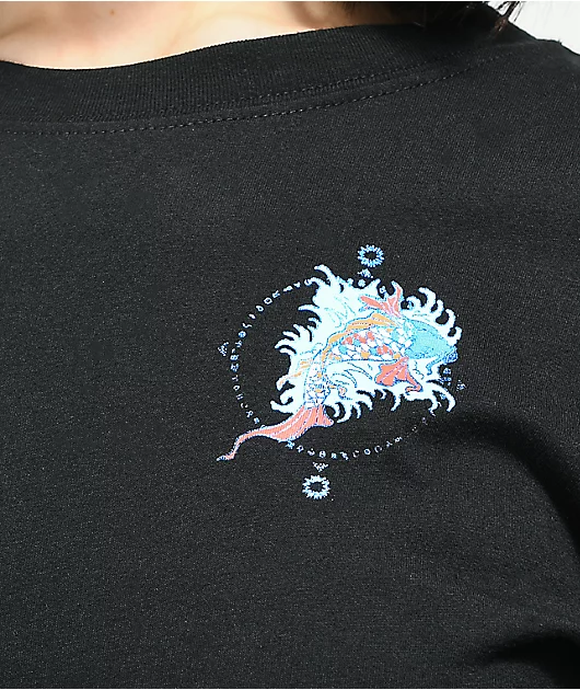 Splash striking color into your shirt rotation with the Sloane Koi Fish black t-shirt from Empyre! This tee features a vibrant screen-printed graphic of a koi fish on the left chest and back, and the tied front detailing adds extra style to the tee’s silh