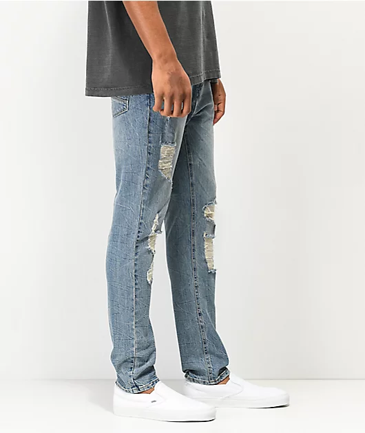 Complete any outfit with the Verge Relay tapered skinny jeans from Empyre. Featured in a versatile light blue wash, theses skinny jeans come with distressing and rips around the knees and thighs for a unique look. Complete with a modern tapered fit, these