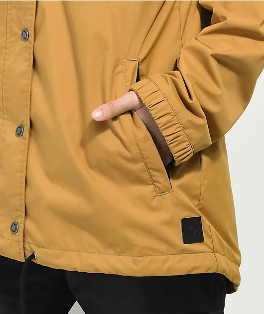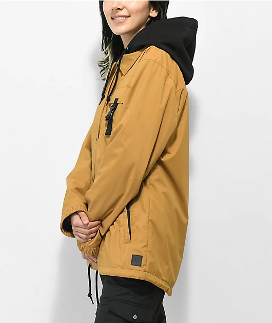 With a boxy layered silhouette, the Harmony Ridge women’s snowboard jacket from Empyre comes in a tan and black coaches jacket design, with a 10K water resistance rating. Blending laid-back style with performance technology, the durable 100% polyester she