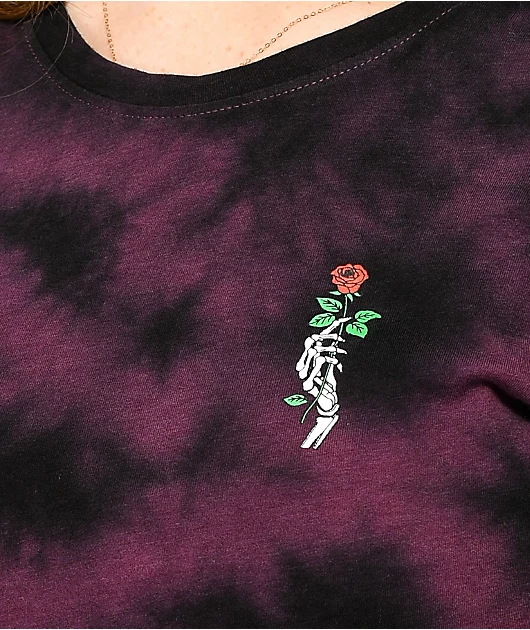 Empyre’s Yohanna Rose Tie Dye T-Shirt offers a slim fit and 19\” length for a shrunken tee look. Featuring a burgundy and dark purple crystal wash design for a unique look, complete with a skeleton hand holding a red rose on the left chest.