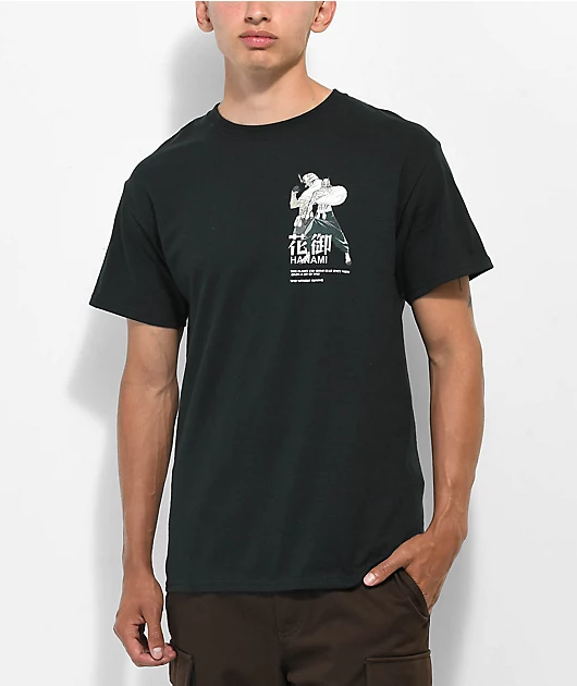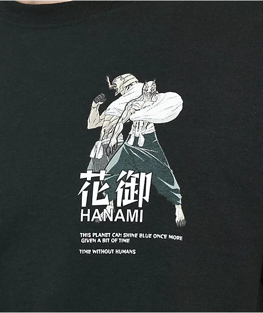 The Hanami t-shirt from the Episode x Jujutsu Kaisen comes in a black colorway with graphics of Hanami on the left chest and across the back. A haunting quote from the character can be seen below, reading \”This planet can shine blue once more given a bit