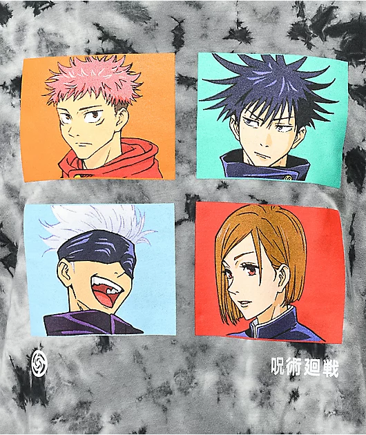 Show off some of your favorite anime characters with the Squad black tie dye long sleeve t-shirt from Episode x Jujutsu Kaisen! This long-sleeve tee features a unique black tie dye treatment throughout, and a screen-printed graphic of four characters from