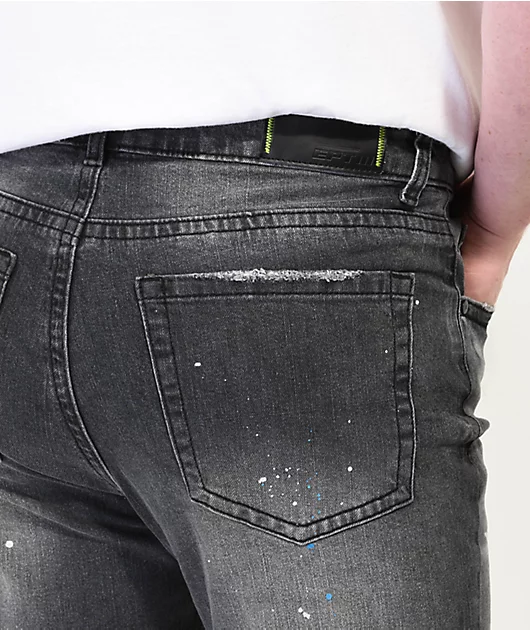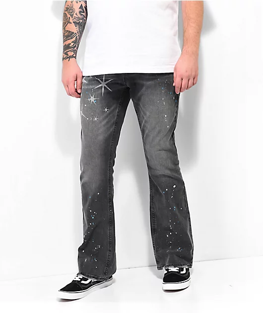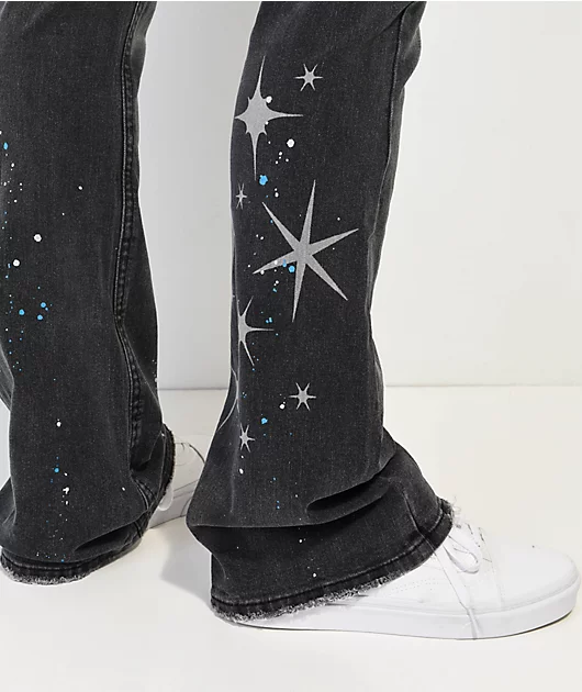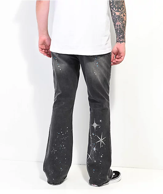 The Kidd EPTM denim jeans come in a black colorway with a stylish tailored fit with a flare leg for a 70s look. These jeans are adorned throughout with intentional paint spatter detailing throughout and sublimated star graphics on the right leg. For style