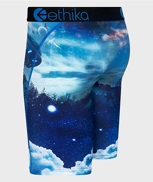 The Alienverse boxer briefs from Ethika feature a black elastic waistband boasting the brand logo in blue and sublimated graphics throughout the legs including an alien in an Ethika hat and bling. These boxer briefs have a lightweight, breathable construc