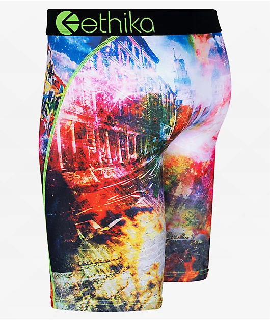 The Ethika All Action boxer briefs are constructed from a blend of polyester and spandex, providing a breathable and stretchy fit perfect for any day. The briefs feature sublimated graphics of action sports throughout, with multi-colored patterns scattere