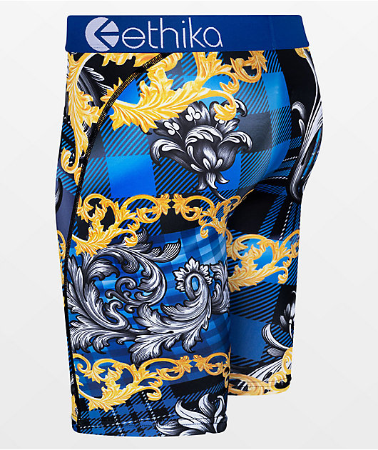 The Alves I’m Him boxers from Ethika come in a brief silhouette with blue plaid colorway, and gold and white paisley pattern throughout. The briefs no-rise technology prevents unwanted ride-up while the flatlock-stitched seams provide maximum comfort.