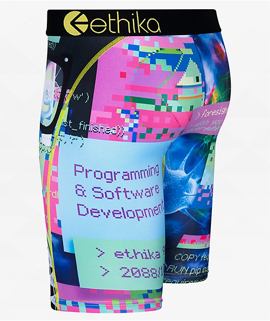 The Bomber Genius boxer briefs from Ethika feature a black elastic waistband with sublimated digital graphics throughout and the iconic shark face logo down the left leg. For comfortable, all day wear, this style has a lightweight and breathable construct