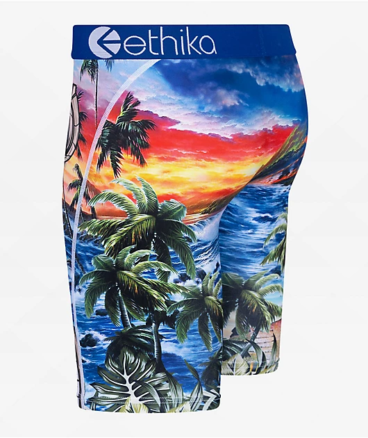 From Ethika, the Bomber Island boxer briefs features a imagery of a tropical island volcano erupting, with parm trees and rolling waves in the foreground. The Ethika boxers are made using a breathable polyester blend, and are finished with flat-lock stitc
