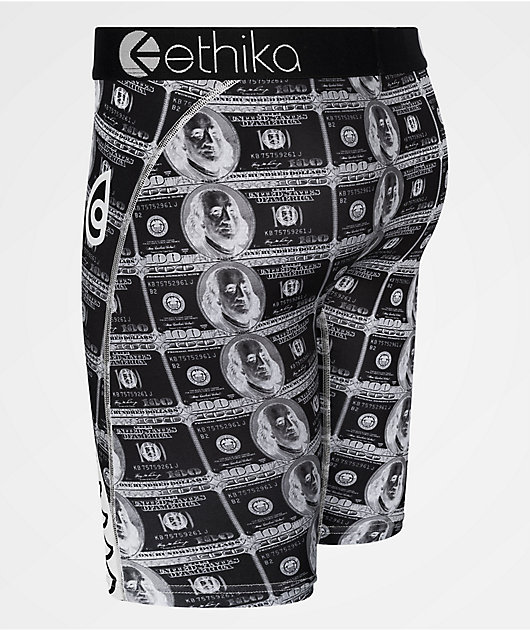 The Money Plate boxer briefs from Ethika feature sublimated graphics of black and white 100 dollar bills throughout, and a reflective, classic Ethika Bomber logo at the left leg opening.