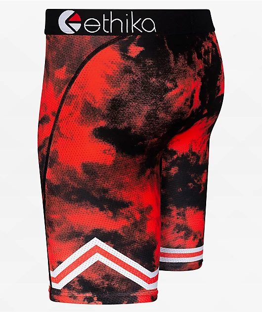 The Buzzer Beater Ethika boxer briefs come in a black colorway with red and black color bursts throughout and a sublimated graphic of a basketball trophy on the left side. These boxer briefs are the height of comfort with a tagless construction, no-rise t