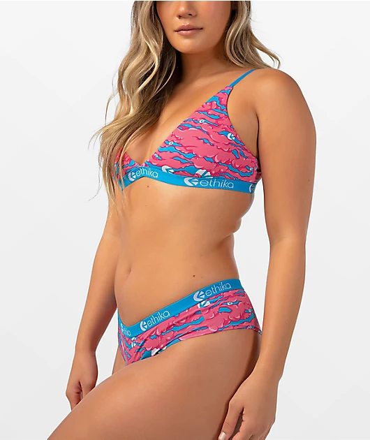 The Chew triangle bralette from Ethika comes in a fun design in the form of sublimated pink, chewed bubblegum strewn across a blue base colorway. It is made from comfy, durable cotton and added spandex for stretchiness, while the adjustable shoulder strap