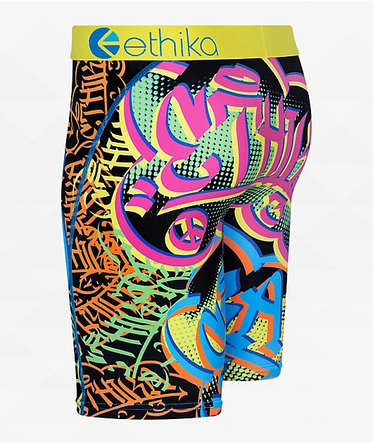 The Ethika Chisel Tip boxer briefs features colorful pink and blue handstyle graffiti lettering sublimated throughout, with light green accents for added contrast. Made from a breathable polyester blend, the athletic boxer briefs have flat-lock stitched s