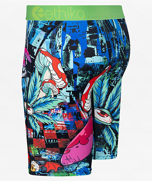 In a green colorway comes the Creep E Trip boxer briefs from Ethika, showing the image of a skeleton wearing a hat with a forest of mushrooms set in the background. These athletic briefs use flat-lock stitched seams and no-rise technology for comfortable