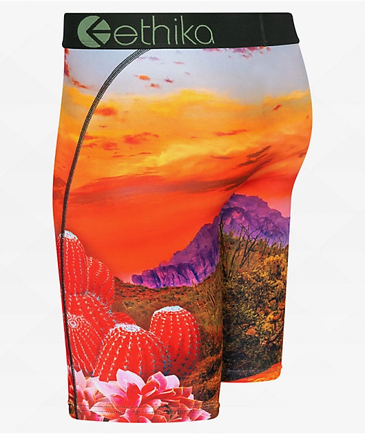 From Ethika Underwear comes the Desert Dog boxer briefs in a vibrant orange colorway. The briefs are adorned by graphics of a desert landscape during sunset, along with a wolf howling at the sky.