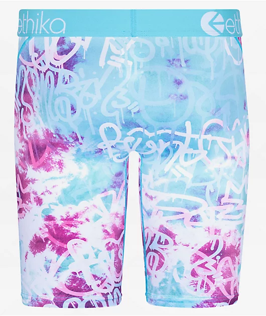 From Ethika comes the Dye Graffiti boxer briefs, featuring blue tie dye and white graffiti-style logo script throughout.