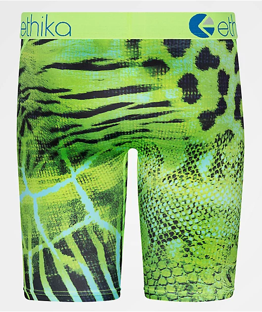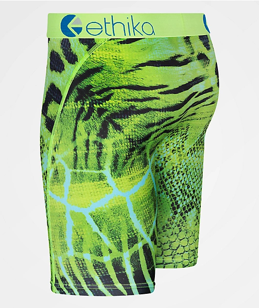 The Exotic Prince Staple Ethika boxer briefs come in a green colorway with a thick, elastic waistband and sublimated animal print throughout, transitioning from tiger to cheetah to snake, etc. For the utmost comfort, these boxer briefs feature no-rise tec