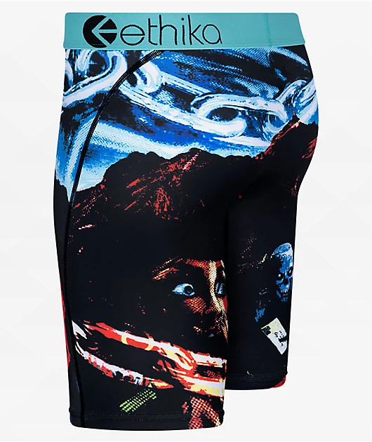 From Ethika, the Familie Night boxer briefs are made from a mosture-wicking fabric with eerie red and blue imagery sublimated throughout. \”Familie\”is written on the left leg, while a large red skull extends along the right. The stretchy Ethika boxer brie